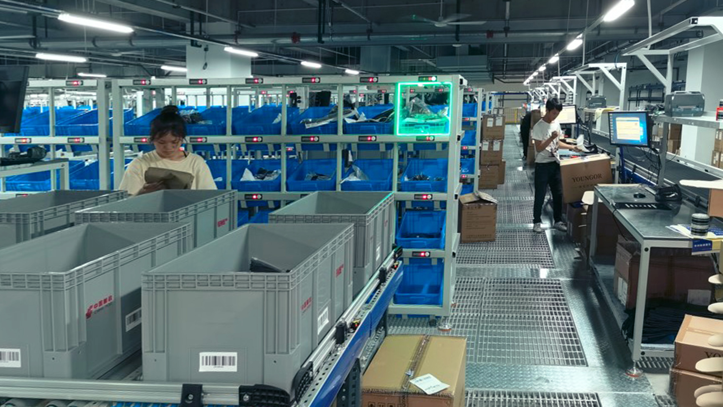 1.5楼是线下营业作业区。。。接纳先提总拣选后播种的方法,,,,提高整体拣选效率,,,,并支持“同款同箱”。。。